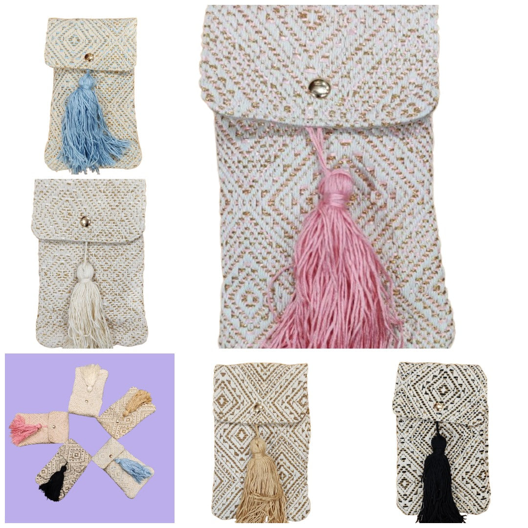 This mini woven or crocheted bag is perfect for carrying small items, such as a phone or wallet. Made with a natural-looking material, it features a flap closure and a decorative tassel in various colors. Compact and versatile, it's an essential accessory for any outfit.